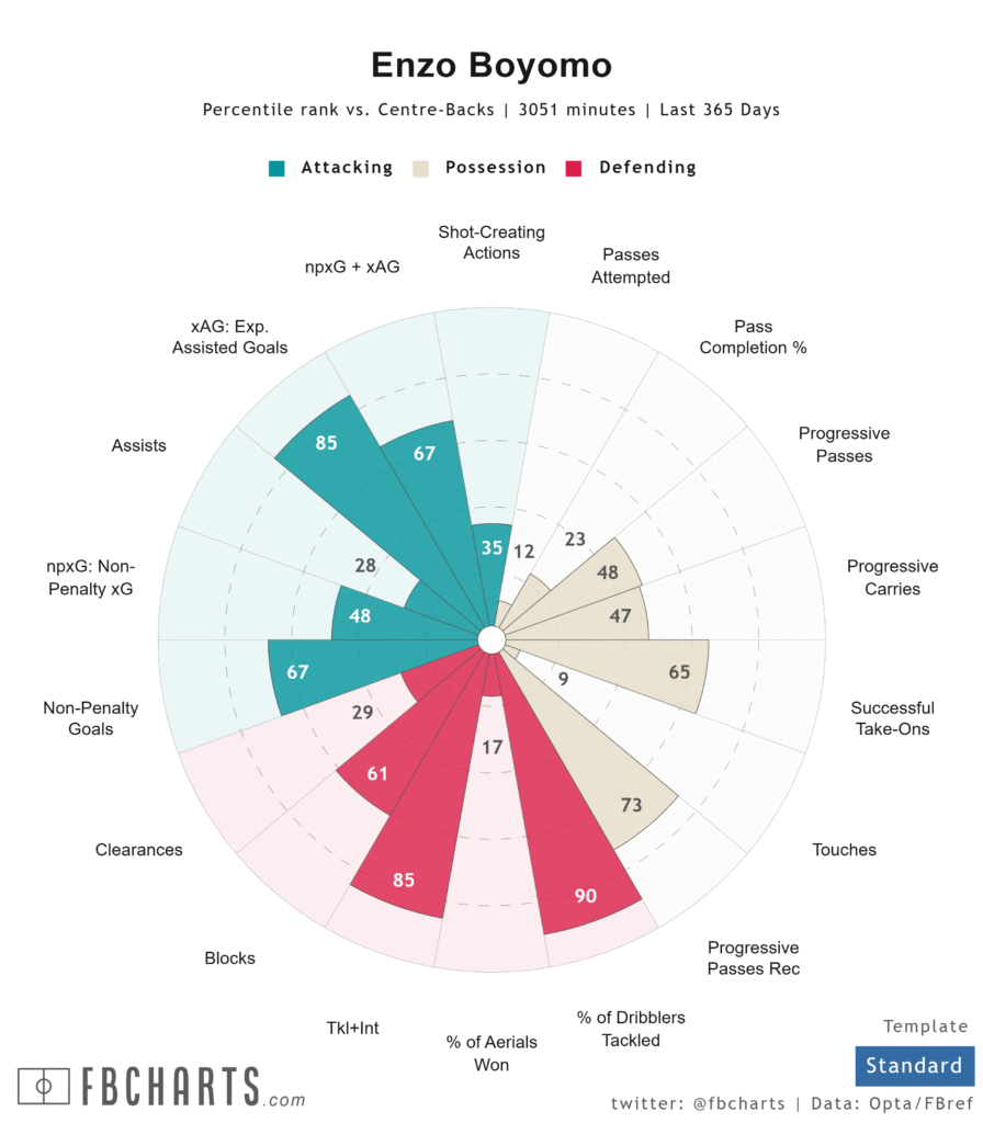 He is not a passive centre-back. Boyomo regularly steps out to stop attacks and does so more often than almost every defender in his peer group. According to FBref, he averages 2.33 successful tackles per 90 minutes, placing him in the 95th percentile among defenders worldwide. His success rate in one-on-one situations, at 76.8 percent, ranks among the best in La Liga.