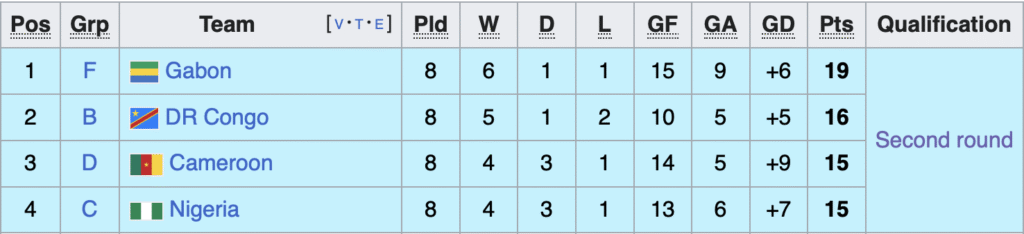 Sharp-eyed observers will notice that each team has only eight games in their total, not ten. Because Eriteria dropped out of the tournament, that left Group H with only five teams (instead of six). To ensure parity among the second-place teams, games against the last place team in each group were removed from the total.