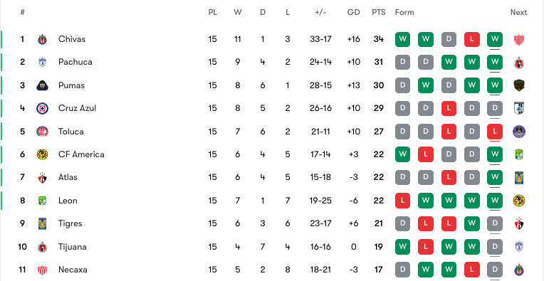 Chivas sit at the top with 34 points, but this is far from a victory lap. A three-point cushion over Pachuca sounds comfortable until you look at the schedule. Necaxa and Tijuana may not be title contenders, but both are the kind of opponents that make life unnecessarily complicated.