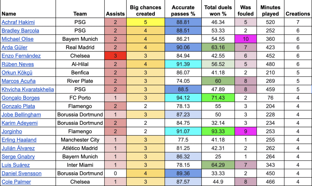 Arda Güler of Real Madrid and Rúben Neves of Al-Hilal were two “rainbow” players who not only notched high creations values, but were also exceptional in the other variables as well.