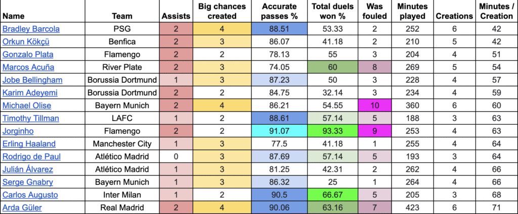 First, a note on our methodology. Creativity isn’t limited to position, so all of them are eligible. The core variables are assists and big chanced created, which when added together are called “creations.” For additional flavor, we added in passing accuracy %, duels won %, and number of fouls drawn.