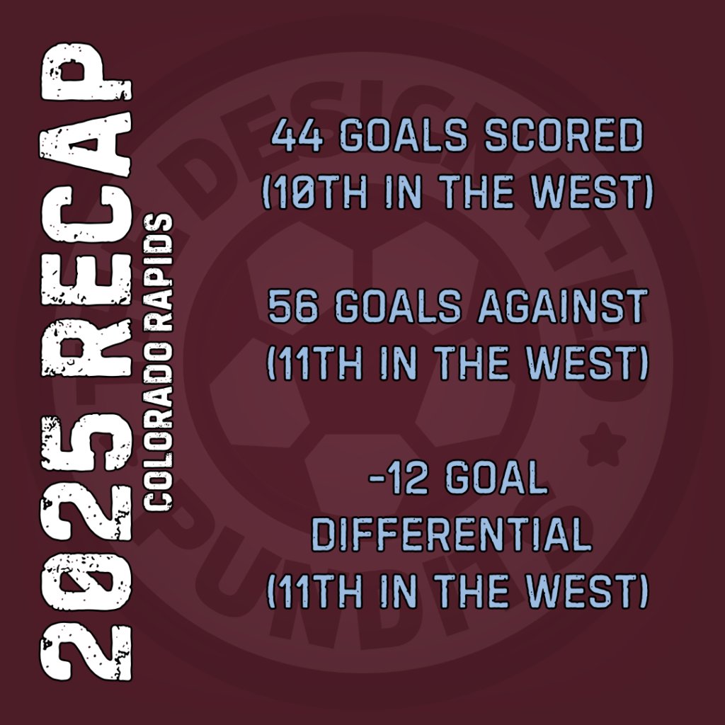 The Colorado Rapids finished 11th in the West in 2025 and missed the playoffs.  They were below average on offense (10 in Western Conference goals) and defense (11th in Western Conference goals allowed). One easily identified area of weakness was playing on the road, where the Rapids finished with only 3 wins on the season.
