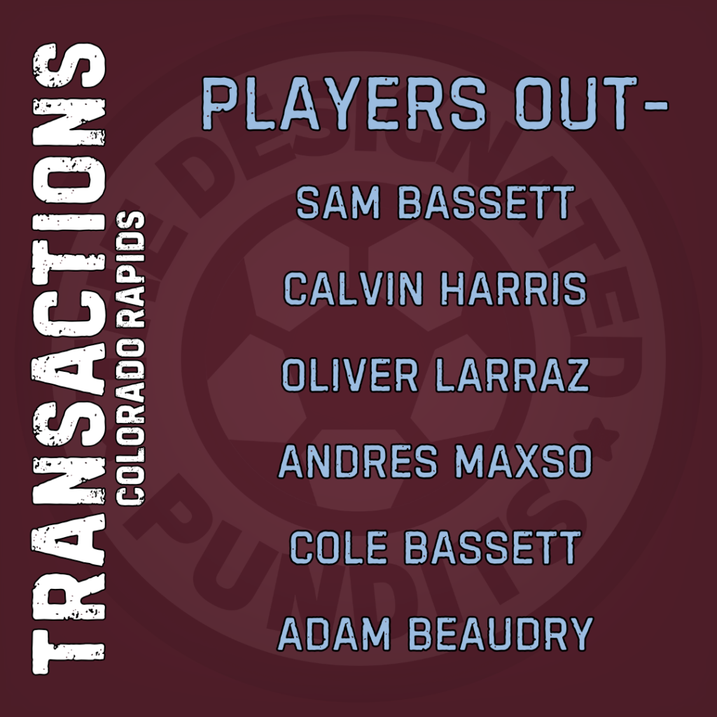 The Colorado Rapids declined the option on 6 players, including Andres Maxso and Sam Bassett. Calvin Harris’s contract expired, as did Oliver Larraz’s.  Cole Bassett was traded to Portland, while Adam Beaudry is headed to Loudon United.