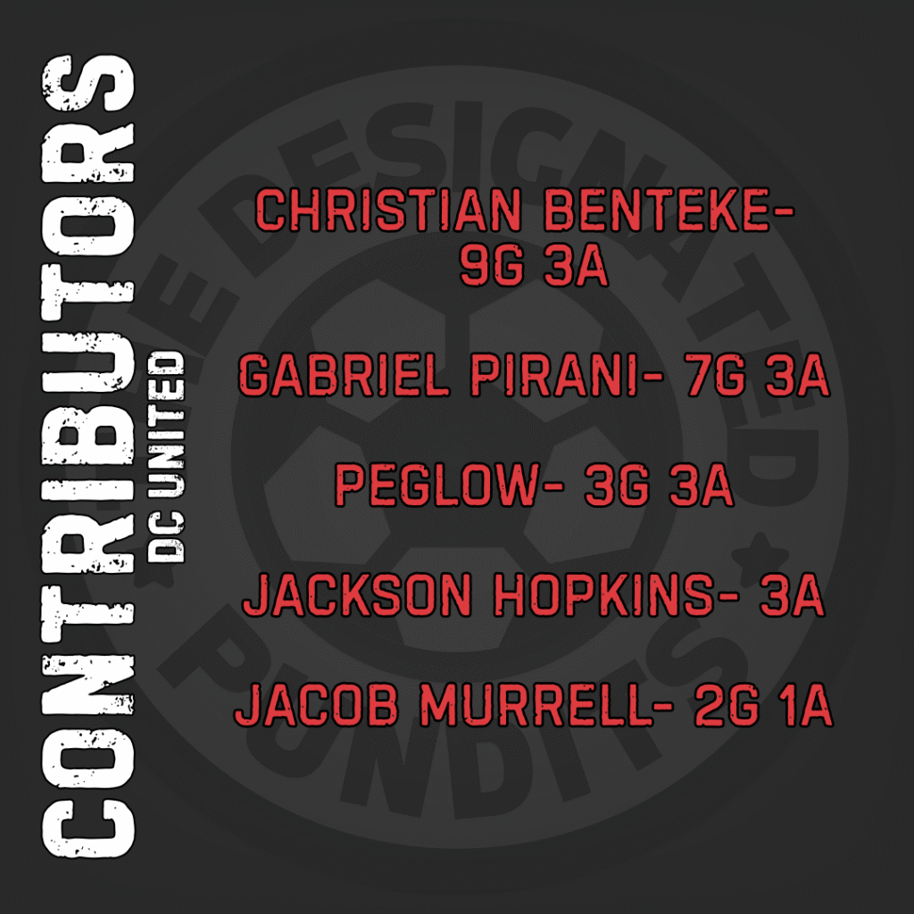 DC United had only a few contributors, led by Christian Benteke’s 9 goals. Gabriel Pirani contributed 7 goals and 3 assists, and DC had no other contributors of note.