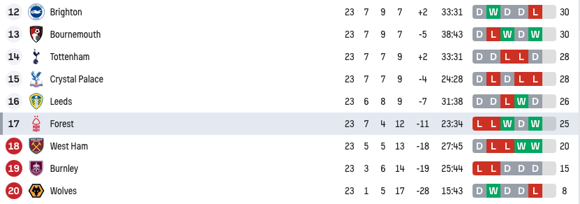 A win for the Eagles would put them above 30 points, which is a huge milestone. But a Forest victory would let them leapfrog Leeds (who will likely lose to Arsenal) and draw level with Palace on points, though below them due to goal difference.