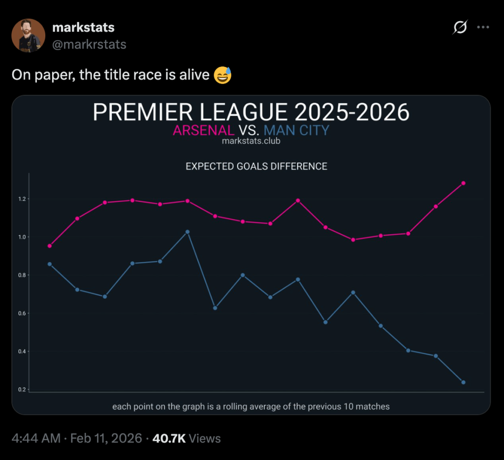 The broader numbers suggest Arsenal’s position is not accidental. As per Opta Analyst, they rank among the top 3 in the league for non-penalty xG, just behind City, and remain near the top for total goals scored. When those attacking figures are placed alongside their defensive record, the picture sharpens. Their xG difference is the strongest in the league, driven largely by the best xG against figure in the division.