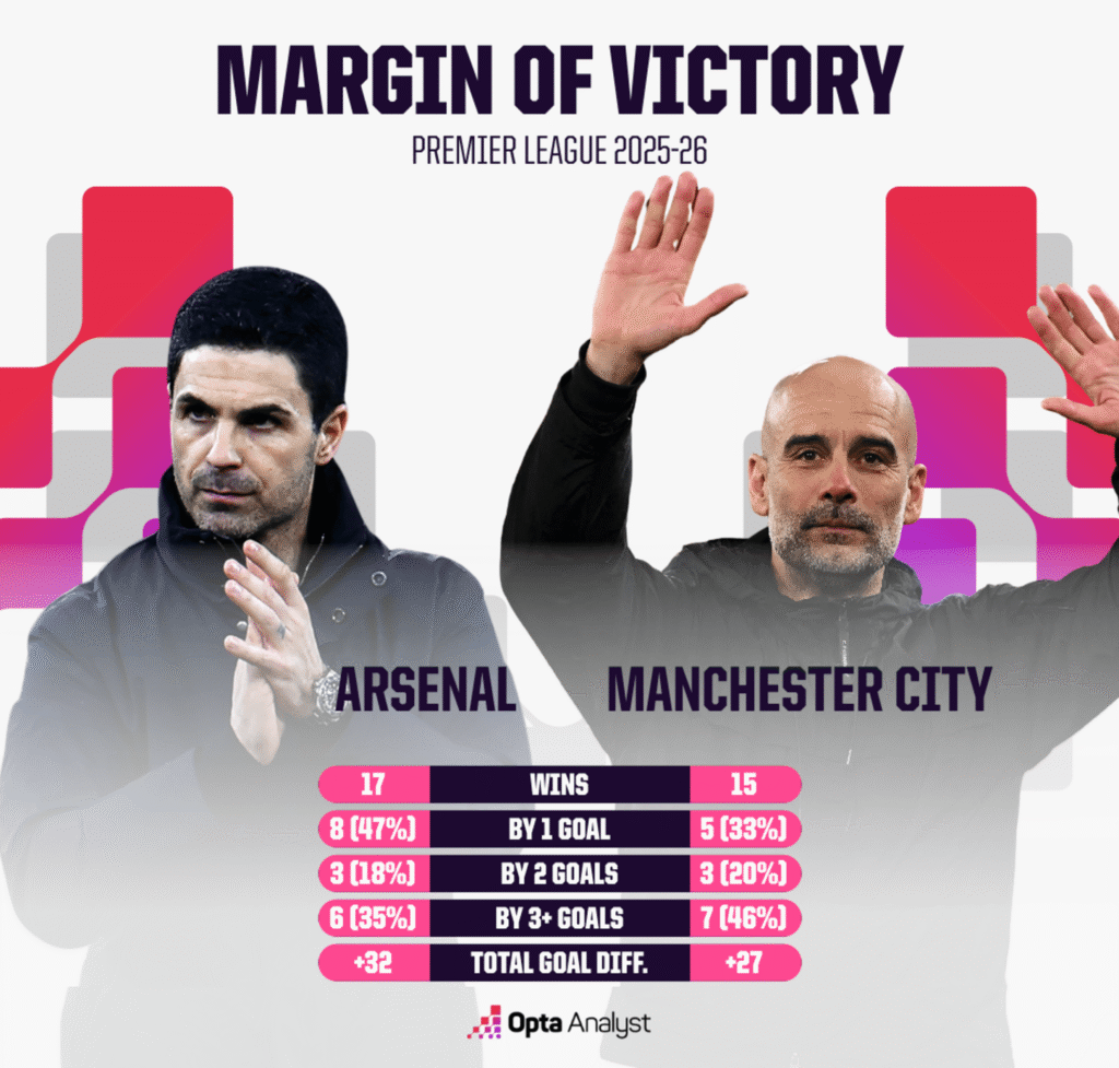 After 26 games, Arsenal lead the table by 4 points. It is an advantage that looks narrow, and perhaps is. Manchester City remain close enough to matter, and close enough to remind everyone how familiar they are with the run-in. The margins begin to explain why the gap feels uneasy. As per Opta Analyst, before facing Leeds, 8 of Arsenal’s 15 wins had come by a single goal. They have been efficient and composed, but they rarely blow teams away. City’s pattern tells a different story. 7 of their 14 wins have come by 3 goals or more, albeit conceding at their own end. The contrast suggests two approaches. Arsenal tighten games. City are still capable of opening them up.