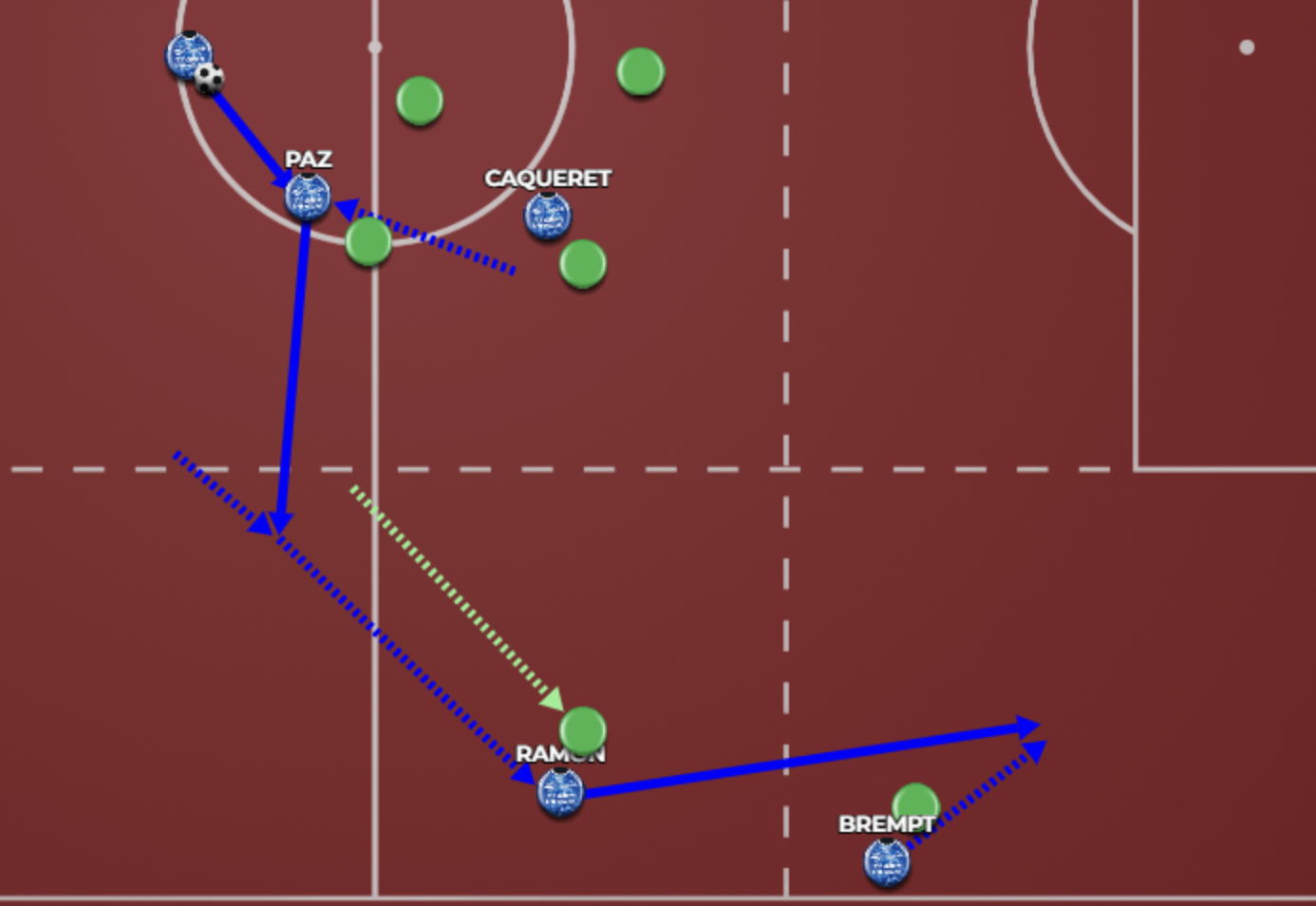 That creates an isolated 1v1 for Van der Brempt against the opposition’s left wing-back on their left side. The right centre-back, Ramon, takes the ball and plays into Van der Brempt’s run. Van der Brempt then draws both himself and his defender toward the touchline, before the next pass is played back inside with the intention of breaking into the penalty area.