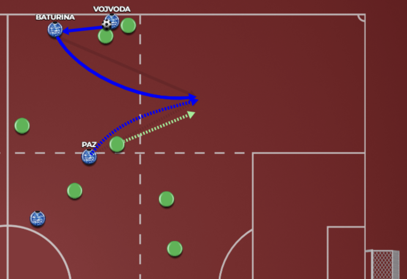Vojvoda and Baturina combined with a few short exchanges on the left side of midfield.