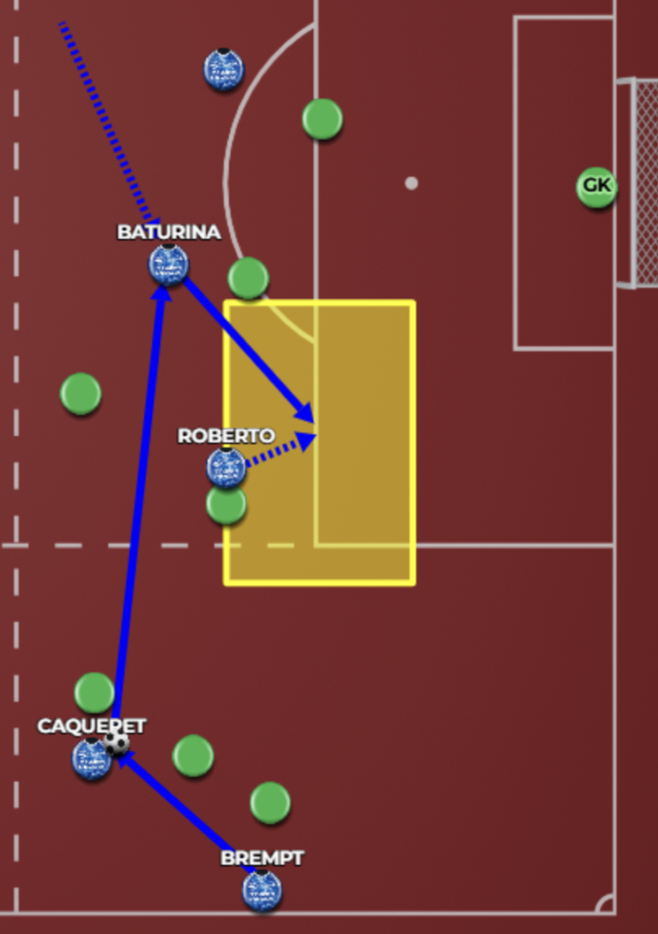 At the same time, Baturina, coming in from the left side, moves toward in front of the penalty area and signals to Caqueret that he wants the ball. As the pass travels into Baturina, Sergi Roberto exploits the mismatched marking and makes a run into the box. The moment Baturina receives, he releases the ball into Roberto’s path.