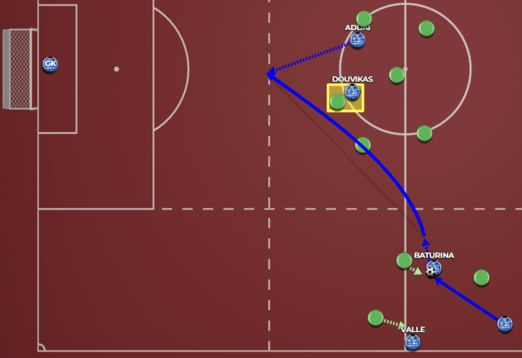 As soon as he turns out, the winger, Addai, starts his run in behind the defensive line. With Douvikas occupying the central centre-back, the back line is not properly aligned. Baturina then clips a long pass into Addai’s path, and Addai goes one-on-one with the goalkeeper.