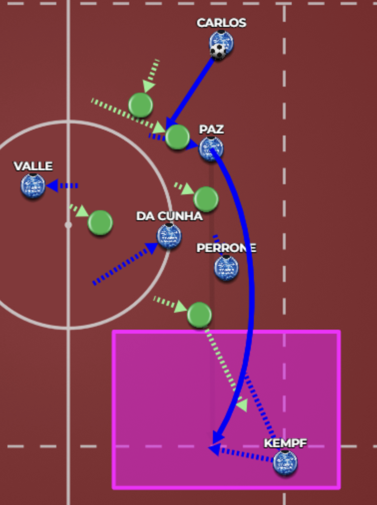 Paz receives from Carlos, and once he plays the pass into Kempf, an opposition player immediately jumps forward to win the ball. Kempf responds with a one-touch push out of his feet and then accelerates onto it. Because the opponent is arriving at speed straight toward him, he can neither reach the ball nor stop Kempf. Then he attacks the open space in front of him and carries the ball into the opposition half.