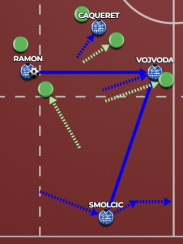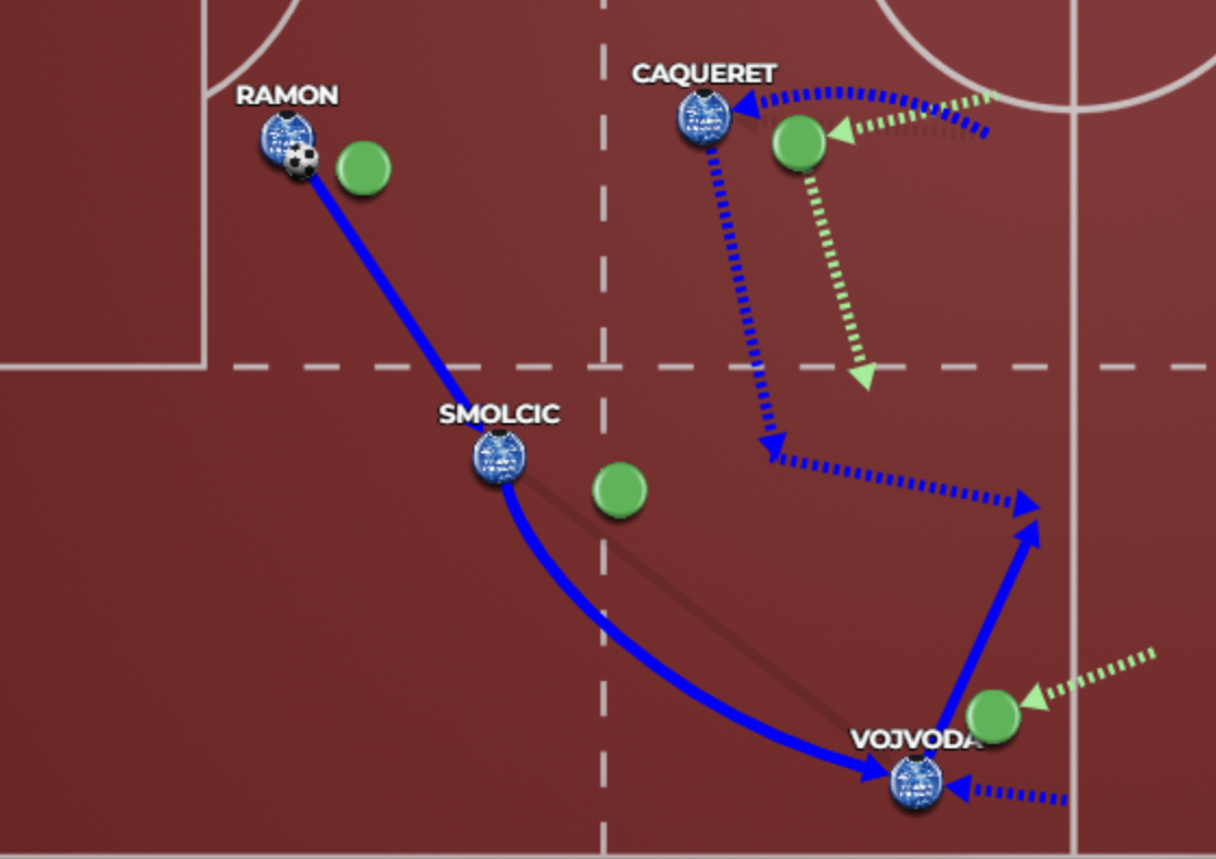 We see a zigzag passing sequence on the right side. It starts with Ramon and continues through Smolcic, Caqueret and Vojvoda.