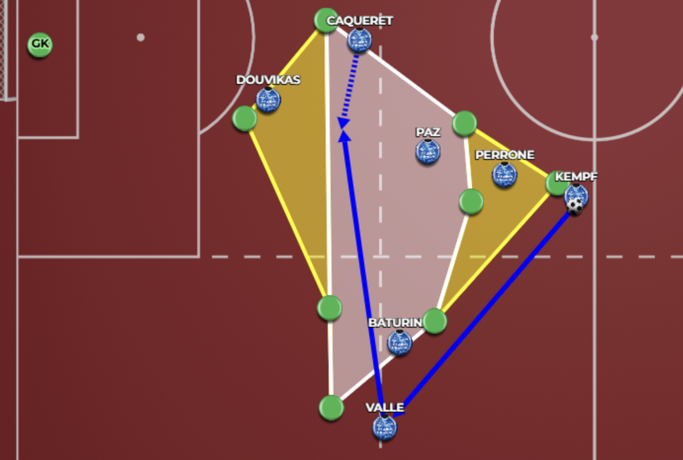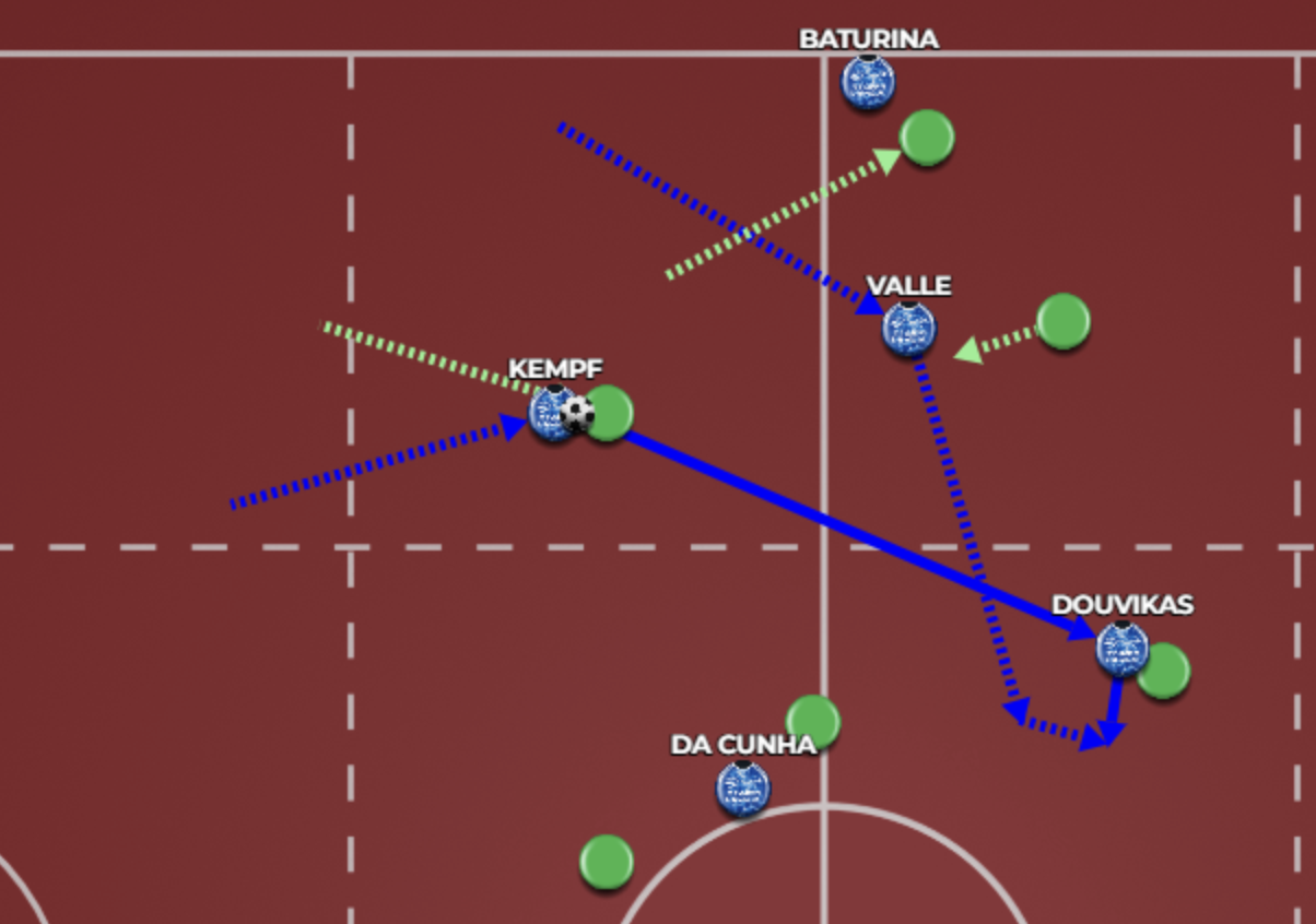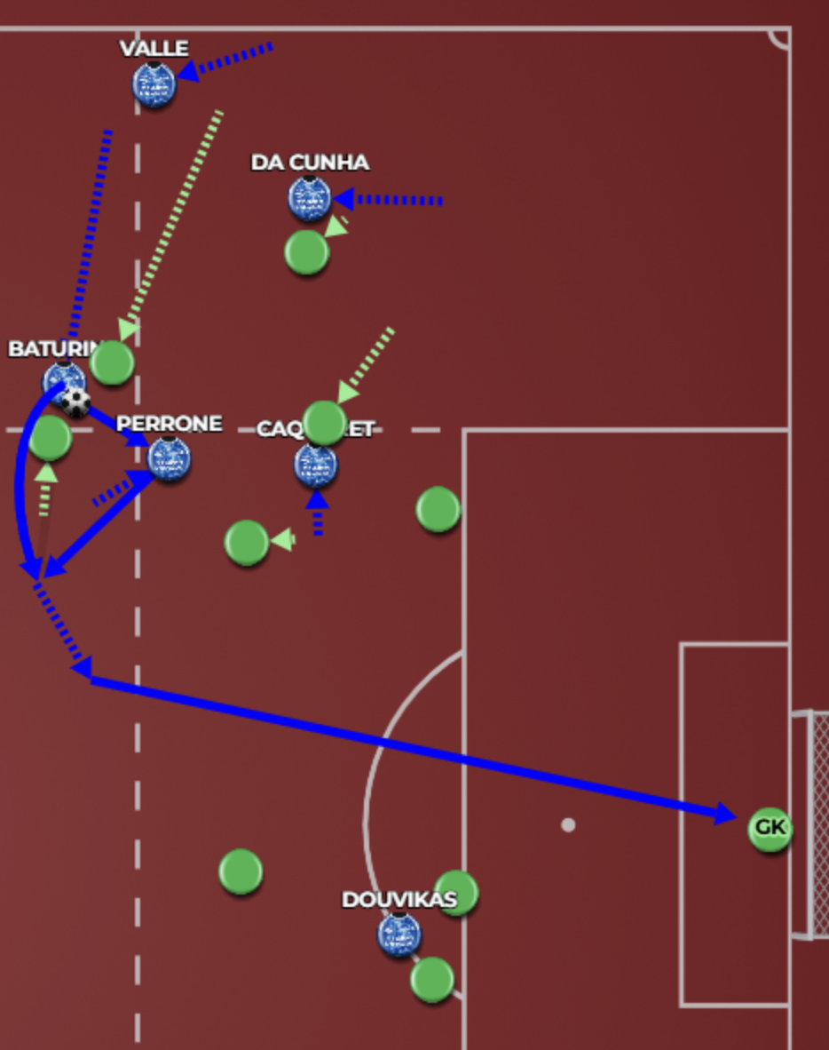 Caqueret then plays a pass that can be received by either Da Cunha or Baturina. Once Da Cunha takes the ball, Douvikas creates separation from his marker and makes himself available. He escapes the pressure with two touches and then threads a through ball into the path of Smolcic, who is overlapping down the right wing.