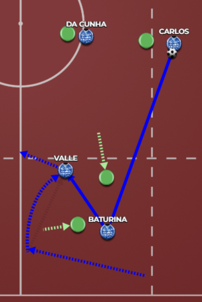 Because the 3–4 opposition players in that area expect the pass to go to Valle, they do not react quickly enough to Baturina.