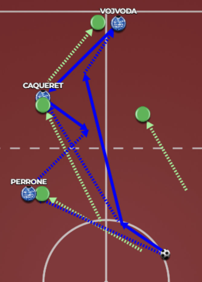 Vojvoda, Caqueret and Perrone use a rotating passing triangle with constant positional interchange. As soon as Perrone passes, he immediately moves forward.