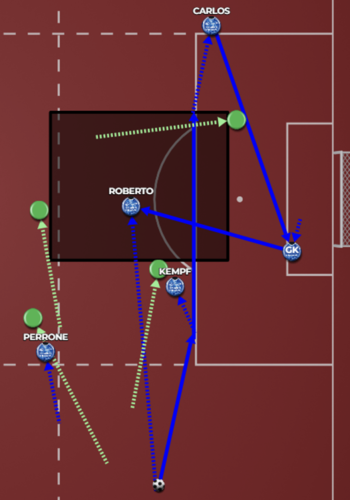 In this attacking sequence, there are only two passes, and the probability of either pass failing to reach its target is very low. The reason is that each player already knows the next action before receiving. When Kempf plays into Valle, he is fully aware of the space between the opposition’s defensive and midfield lines. Caqueret also knows where Valle is going to direct the next pass. That is why he can receive on the move, with momentum, and reach the edge of the opposition penalty area through just two safe passes.