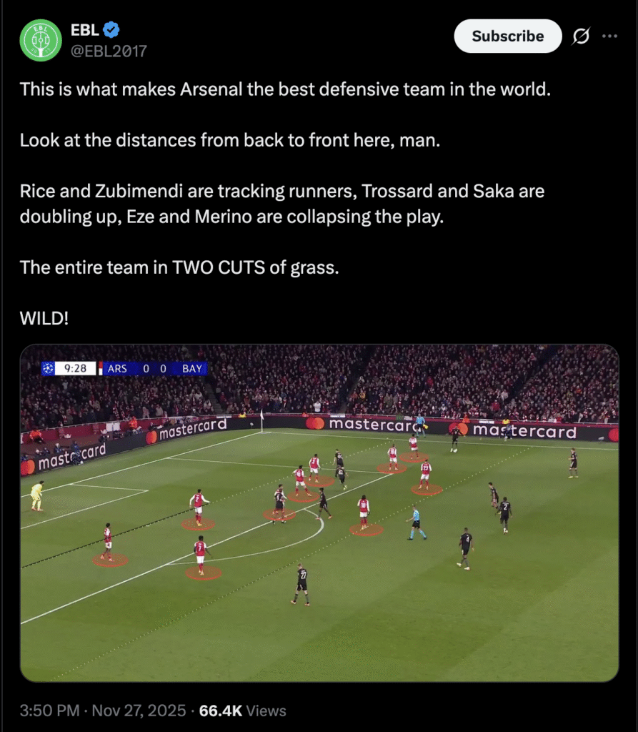 There is another reason behind Trossard’s run of games this season, and it lies on the other side of the ball. Arteta has always valued discipline without possession, and it is often the detail that decides who plays. Martinelli earned many starts in the past because he tracked runners, pressed with intensity, and held his ground in deeper zones. The arrivals of Eze and Madueke added more options who could offer that same work. Trossard has matched that standard this season and at times even pushed past it. He has pressed with intention, closed spaces quickly, and shown a willingness to recover into deeper lines when the team needs it. His contribution in these moments has been as important as anything he does in the final third. Take a look at the image below to see how he played his part against Bayern Munich.