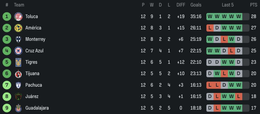 In the buildup to matchday 13, the current Liga MX table provides limited surprises in the top half, until we see Tijuana in sixth.