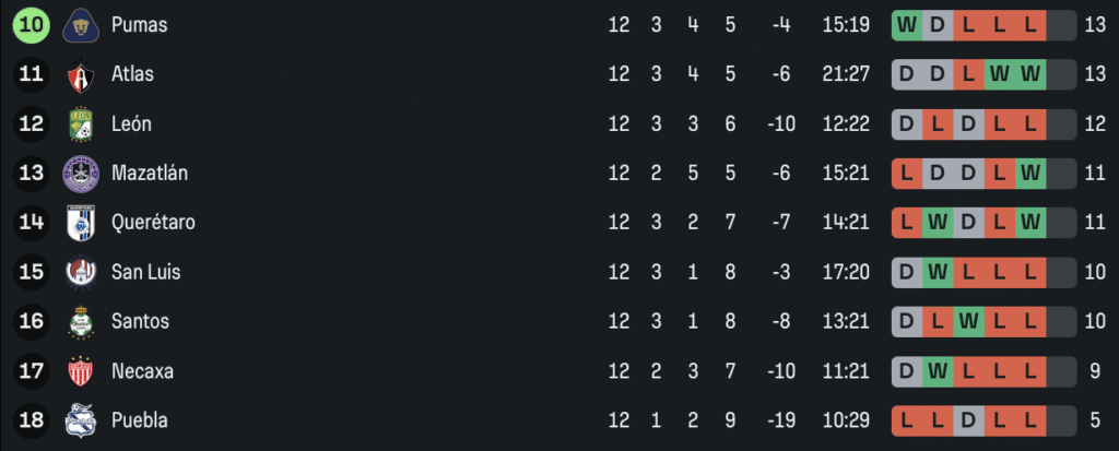 Stuck in 17th position, new manager Fernando Gago needs a miracle to turn around this nightmare start with the club. Four points adrift of the playoff spots, Los Rayos face Cruz Azul and Tigres in their upcoming fixtures, two sides expected to make deep playoff runs. Then they close out the regular season with more winnable matches against Atlético de San Luis, Santos Laguna, and Mazatlán.