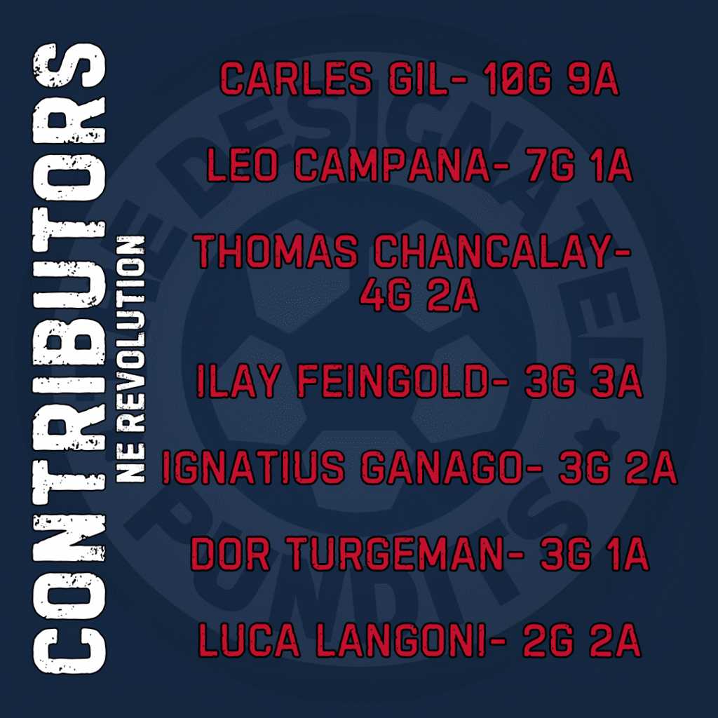 Carles Gil led scoring for the Revolution with 19 total contributions. Leo Campana had a disappointing 7 goals, while Thomas Chancalay never quite got healthy and had only 4 goals and 2 assists.