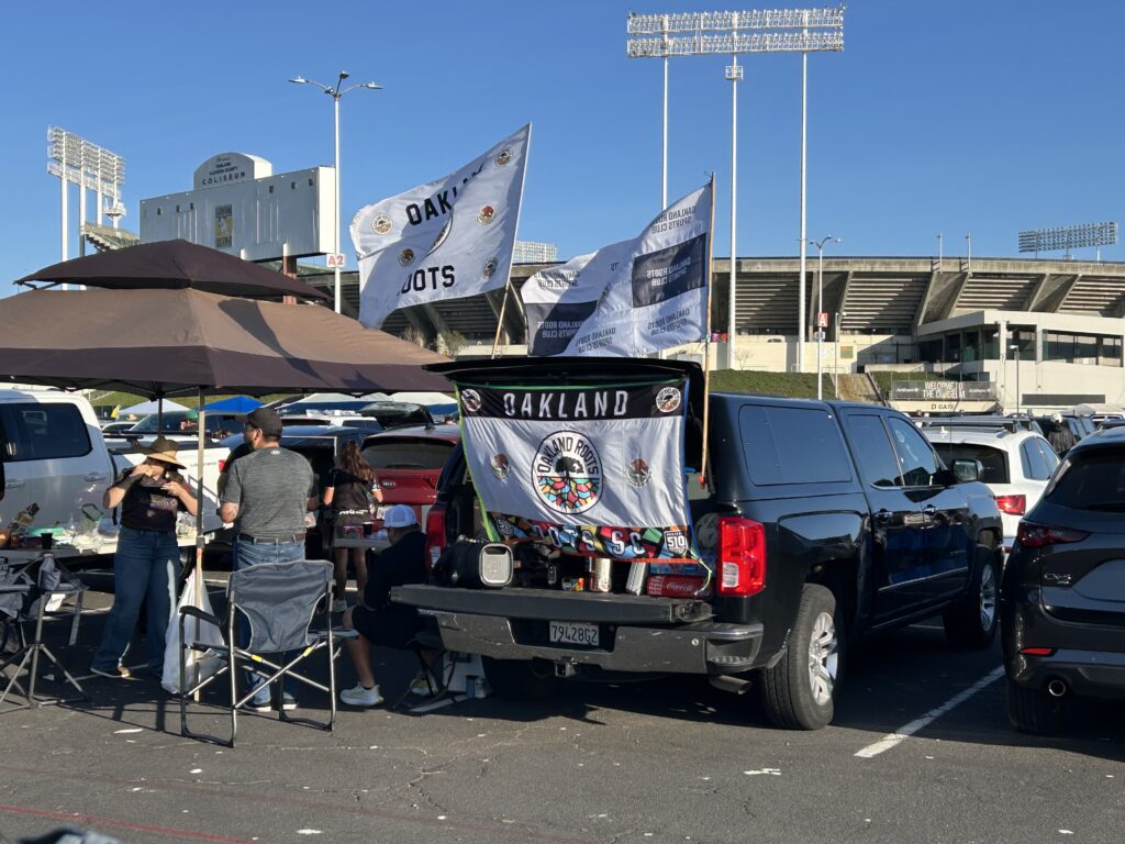 Roots games are more akin to block parties, particularly in the pre-game. Oakland rapper Ian Kelly performed songs from his upcoming LP “Concrete Ocean” to head-bobbing crowds queued up for the food trucks. Other local musical icons P-Lo, G-Easy and E-40 were in the crowd; no doubt Billie Joe Armstrong from Green Day was somewhere as well. All four, along with Oakland native Marshawn Lynch, are part of the expansive and community-based ownership of the club. Among the vehicles, barbeques and ball-kicking kids you could see many supporters rocking an “owner” t-shirt which is given to community investors.