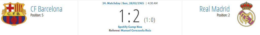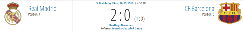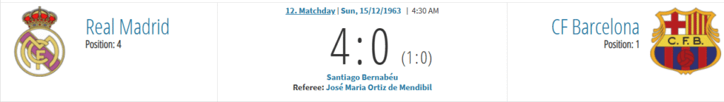 The following season, history repeated itself. Despite Barcelona entering as league leaders, Puskás scored his second consecutive Clásico hat trick in December, with Di Stéfano also on the scoresheet. By the time of the next meeting, Madrid had regained top spot. Goals from Puskás and Gento extended the streak to five games unbeaten.