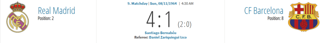 Five months later came the first Clásico of the 1963/64 season. Real Madrid topped the league while Barcelona sat fifth. Di Stéfano scored twice to extend the gap between the two rivals. In the return fixture, Barcelona had slipped to seventh in the league, while Madrid remained top. Once again the usual names dominated. Gento and Di Stéfano scored, and Puskás netted a hat trick, his 14th goal of the season.