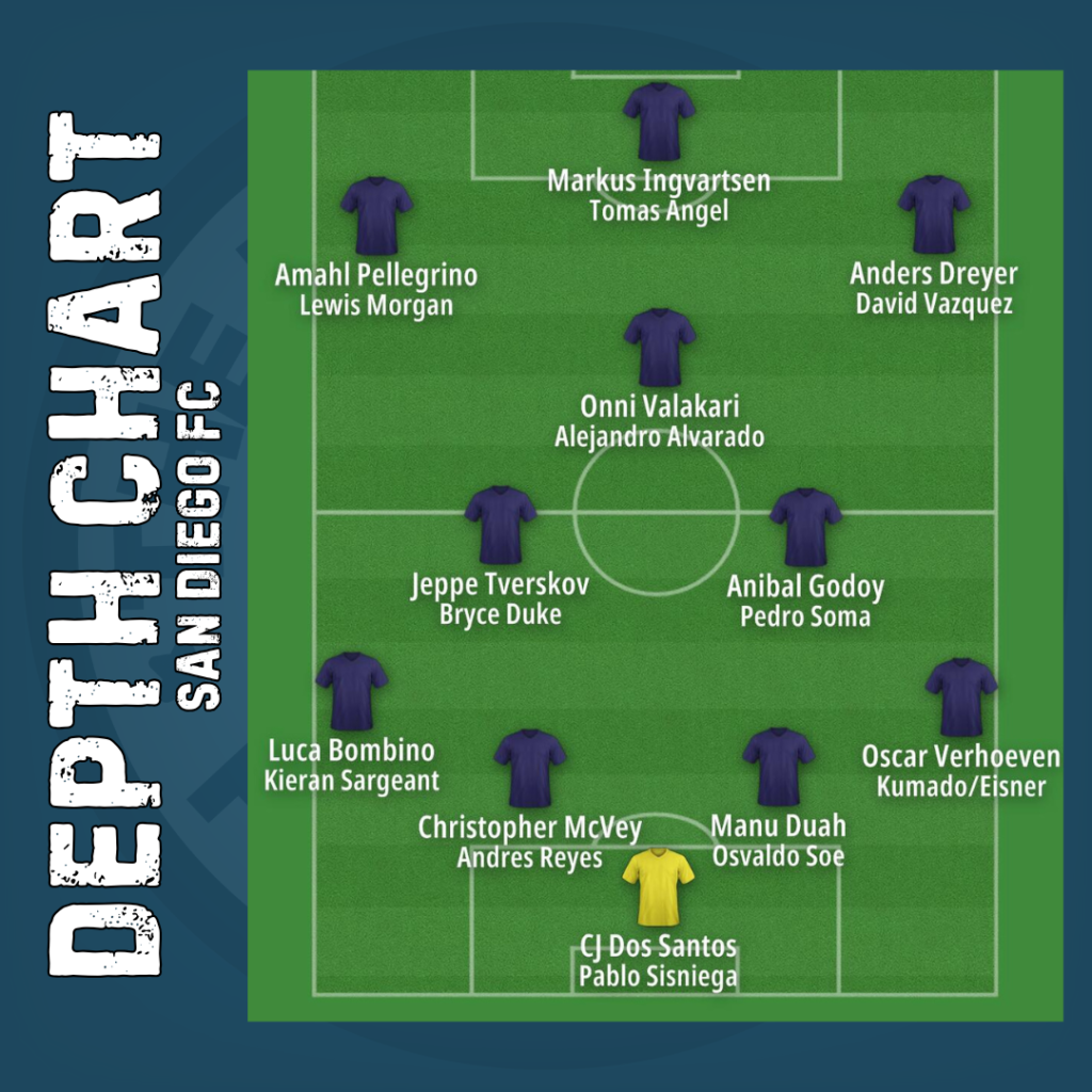 San Diego FC should play an attacking 4-3-3 this season. In the attack, Amahl Pelligrino should have first shot at winning the left wing vacancy left by Hirving Lozano. Dreyer, an MLS best-11 caliber player returns on right wing, and Markus Ingvartsen will be the striker. Ingvartsen was hurt and missed much of 2026, but Mikey Varas has assured the club that he is healthy heading into 2026.