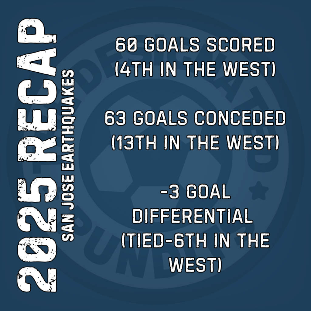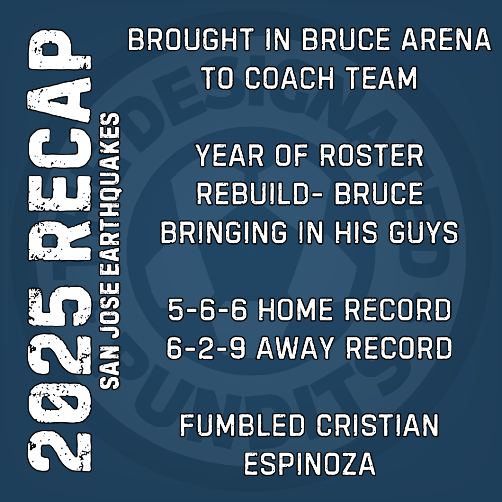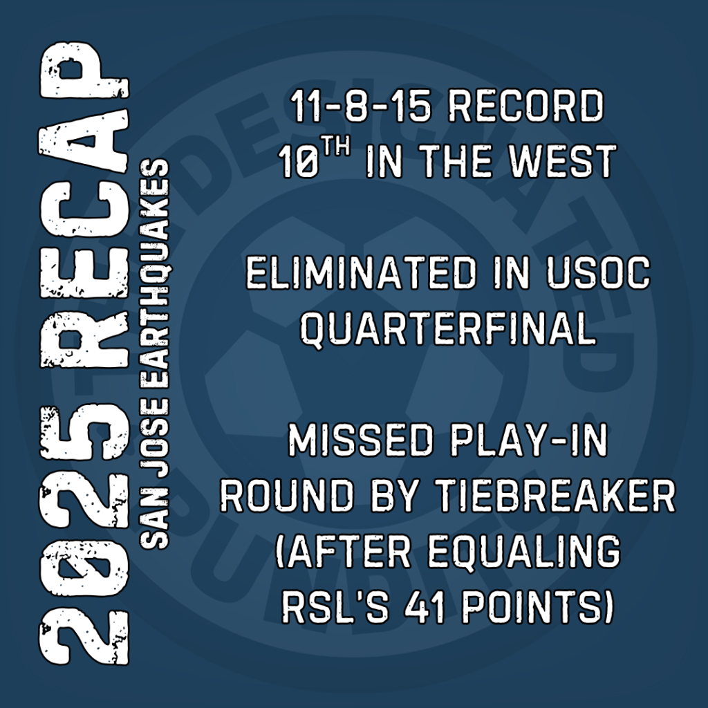 The San Jose Earthquakes’s 2025 season was very much a transition year. The Quakes signed legendary coach Bruce Arena, who quickly brought in a bunch of his former New England Revolution players to start San Jose’s rebuild. The end result was a 11-8-15 record, leaving the Quakes out of playoff contention. However, this was a 41 point season, up 20 points from the previous year (which brought San Jose the infamous Wooden Spoon).