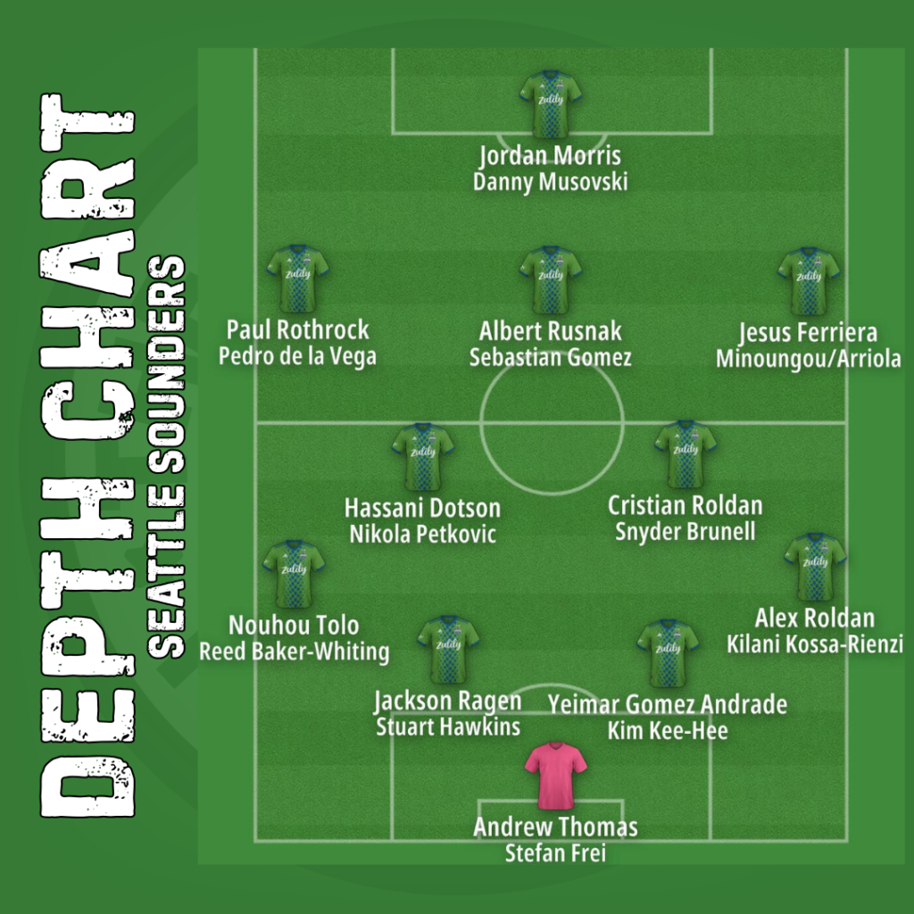 The Seattle depth chart has question marks, namely because injuries and availability issues kept them from having a steady 11 in 2025. We assume they will line up in a 4-3-3 that looks more like a 3-4-3 or 3-5-2 in possession.