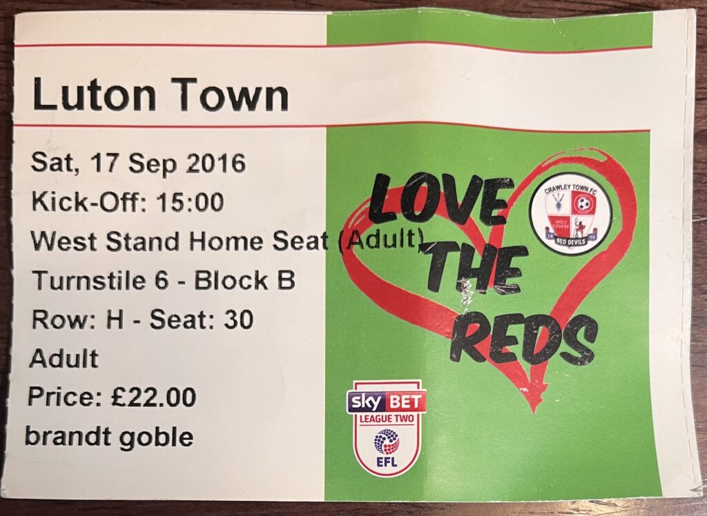 It was fate. Crawley Town won the game 2-0. I love telling the story about how I fell in love with Crawley Town with the intention to watch them climb up and through the EFL pyramid to reach the holy grail that is the Premier League. So far they have made up to League One, at least for last season, only to be back starting the climb again this season in League Two.